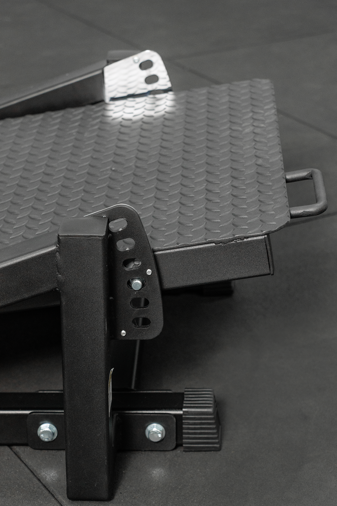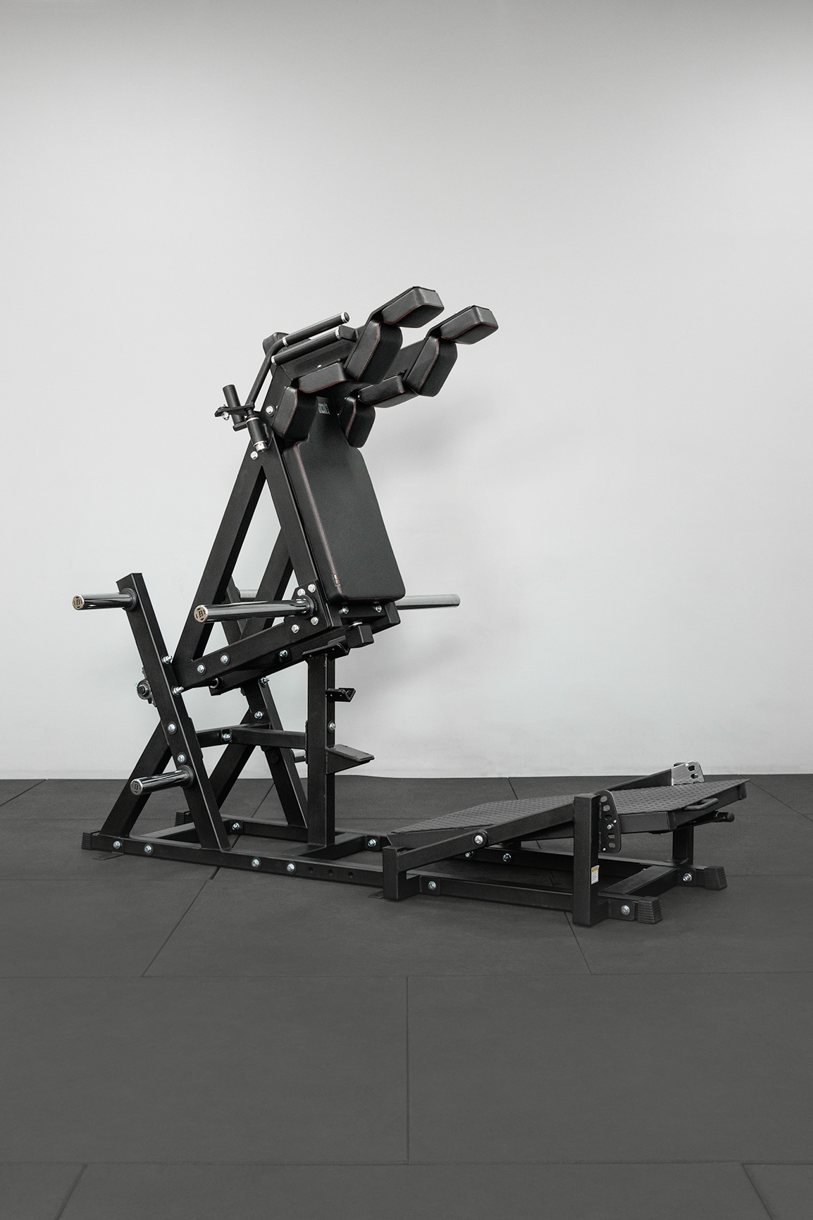The release mechanism allows for full squat depth while a secondary stop prevents squatting too deep. The oversized, adjustable foot plate offers multiple foot positions to target different areas such as glutes, hamstrings, quads, and calves, while multiple ridges prevent slipping.