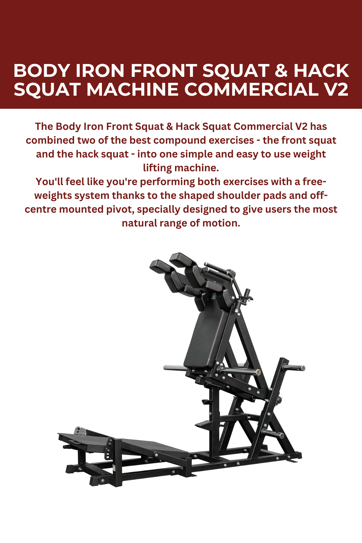 The Body Iron Front Squat & Hack Squat Commercial V2 combines two of the best compound exercises—the front squat and the hack squat—into one simple and easy-to-use weight lifting machine.