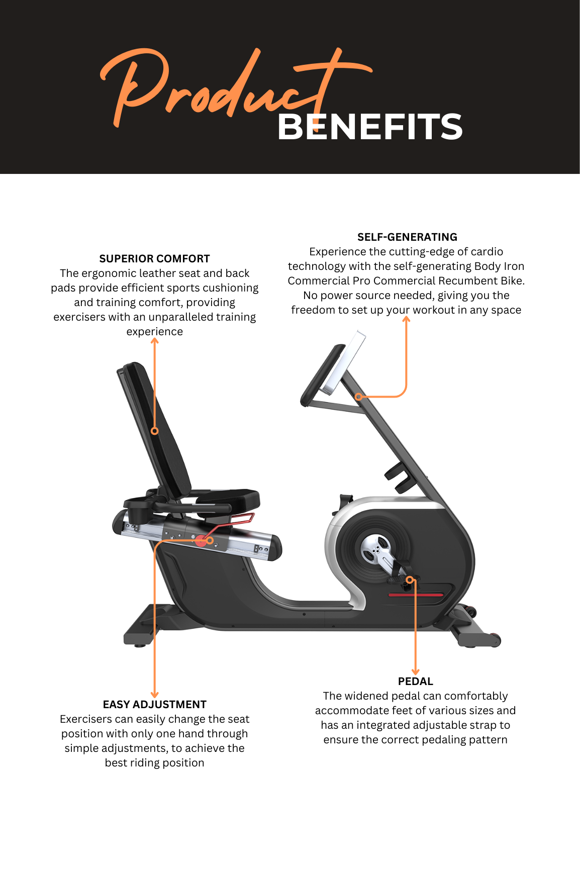 The Body Iron Commercial Pro Recumbent Bike (Self-Generating) delivers low-impact, joint-friendly cardio with full commercial durability. Designed for both home and commercial gym environments, this recumbent bike combines a comfortable reclined riding position with smooth magnetic resistance – perfect for rehabilitation, general fitness, and serious endurance training.