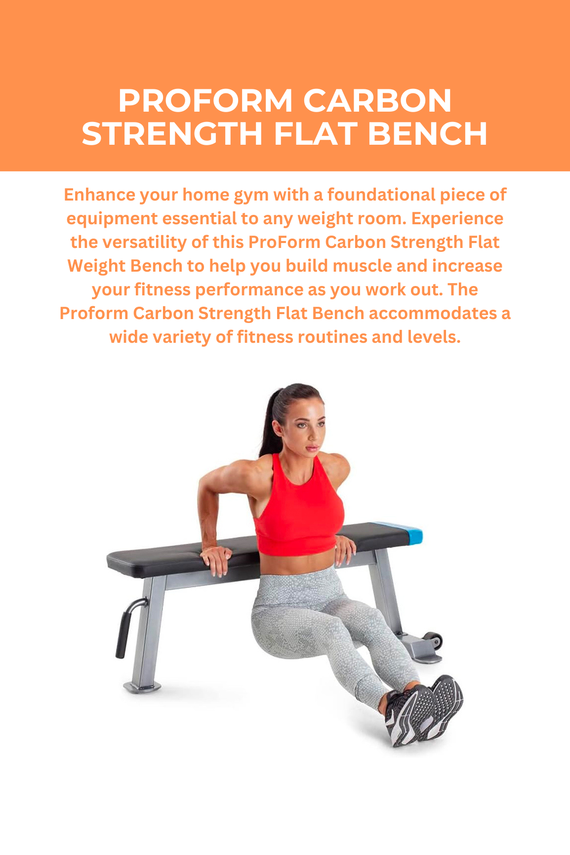 The ProForm Carbon Strength Flat Weight Bench is a solid, space-efficient bench designed to support a wide range of strength exercises in your home gym. From dumbbell presses and rows to core work and accessory training, this flat bench provides a stable base to help you build muscle and improve performance.