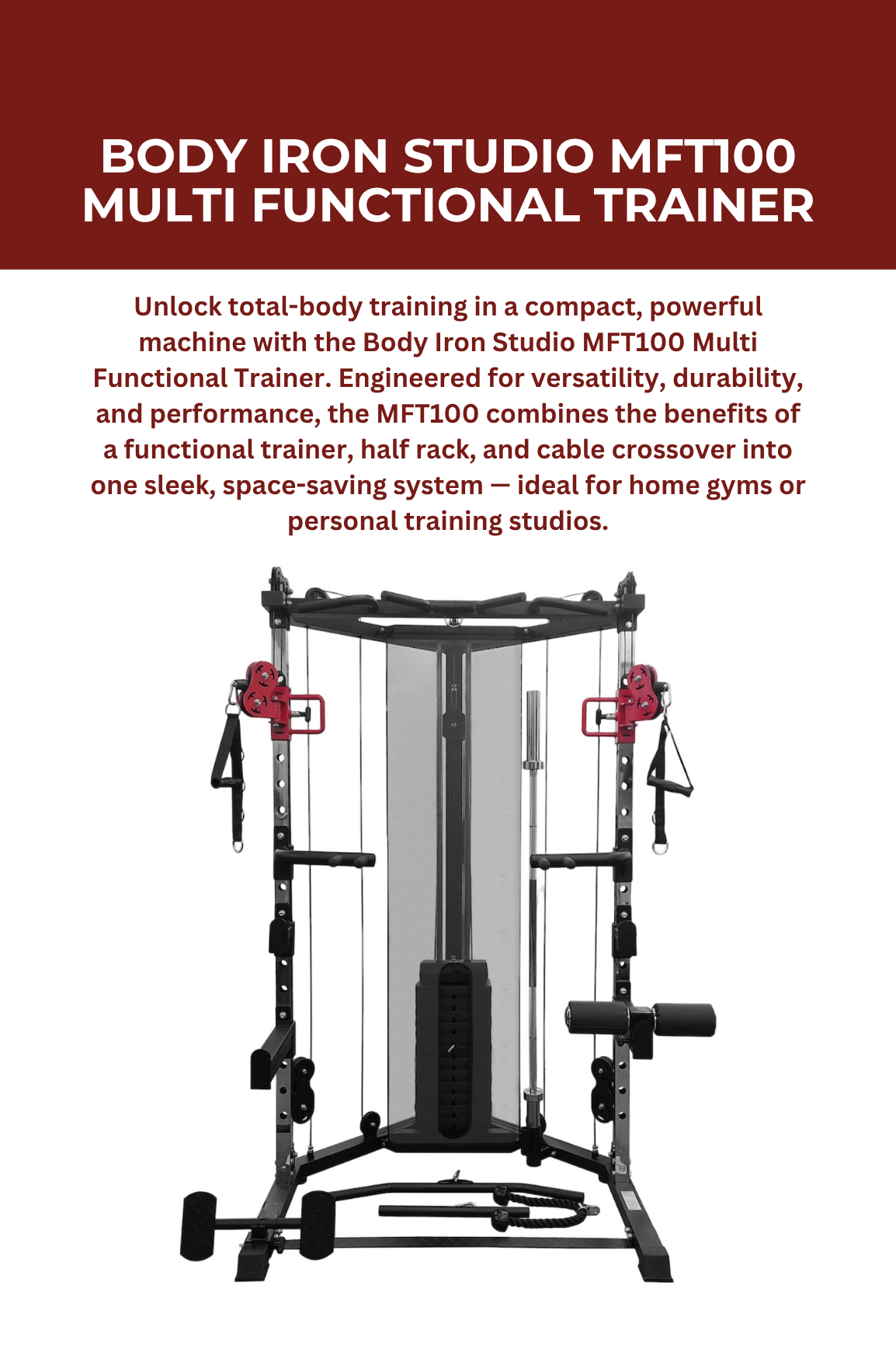 The Body Iron Studio MFT100 Multi Functional Trainer is a premium all-in-one strength solution designed for maximum versatility in a compact footprint. Combining a functional trainer, half rack, and cable crossover into one integrated system, the MFT100 is ideal for home gyms.