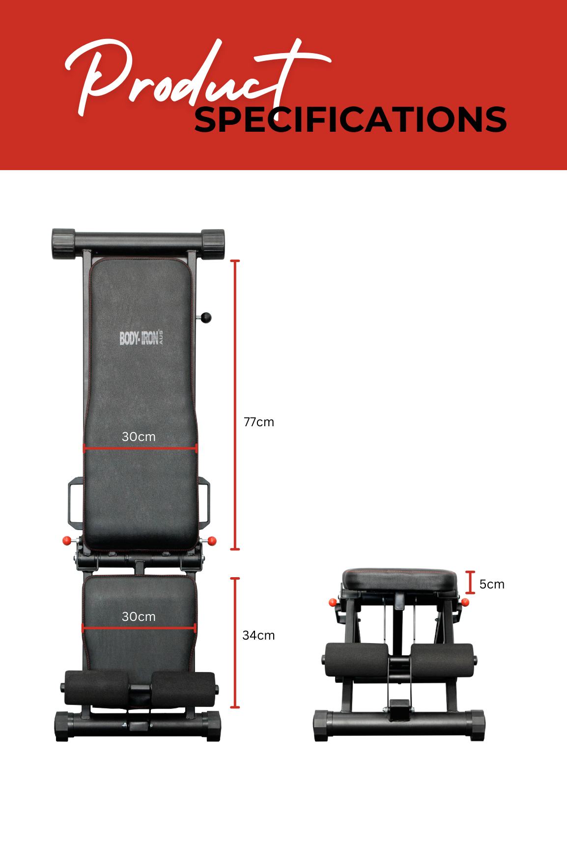 The sleek all-black finish and compact footprint make the Body Iron SF1000 the ultimate fold-away adjustable bench for those wanting premium performance, true decline function, and efficient space-saving storage — without compromising strength.