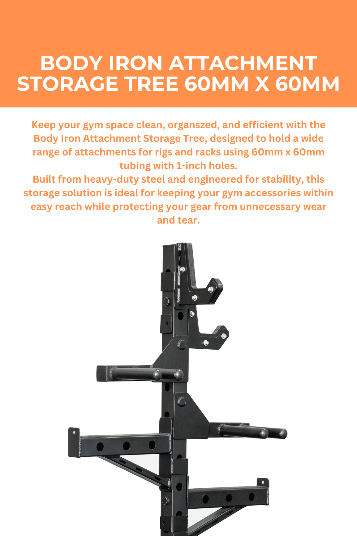 Keep your gym space clean, organized, and efficient with the Body Iron Attachment Storage Tree, designed to hold a wide range of attachments for rigs and racks using 60mm x 60mm tubing with 1-inch holes.