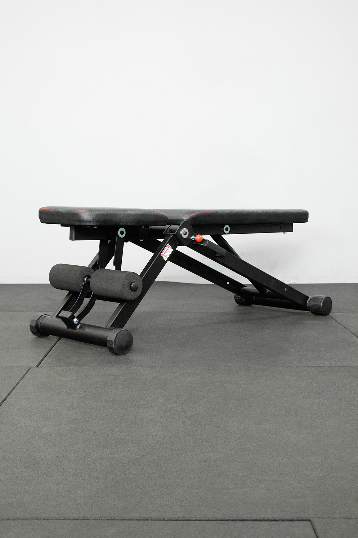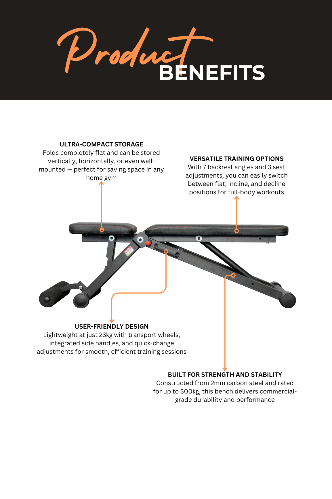 The sleek all-black finish and compact footprint make the Body Iron SF1000 the ultimate fold-away adjustable bench for those wanting premium performance, true decline function, and efficient space-saving storage — without compromising strength.