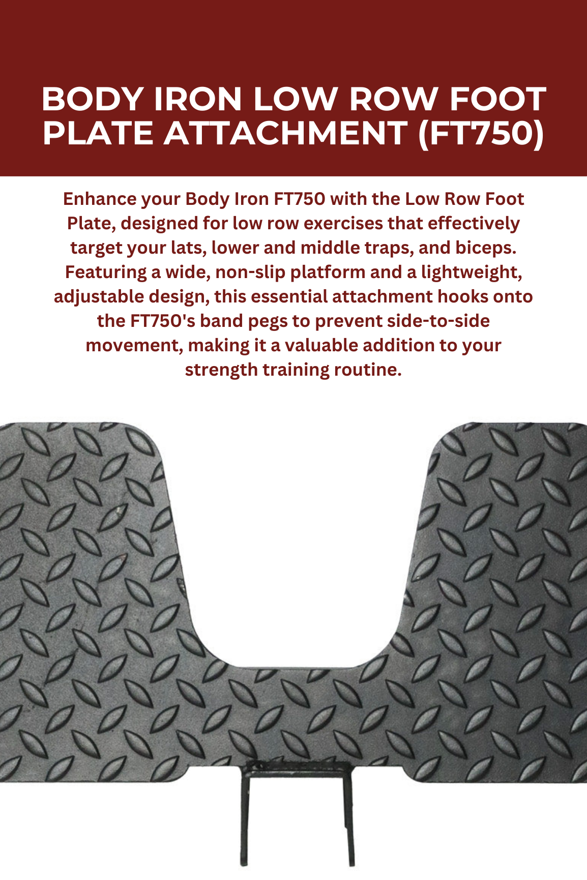 Enhance your Body Iron FT750 with the Body Iron Low Row Foot Plate, perfect for performing your favorite low row exercises. This attachment effectively targets your lats, lower and middle traps, and biceps. Featuring a wide, non-slip platform and a lightweight, adjustable design, it’s an essential addition to your strength training regimen.