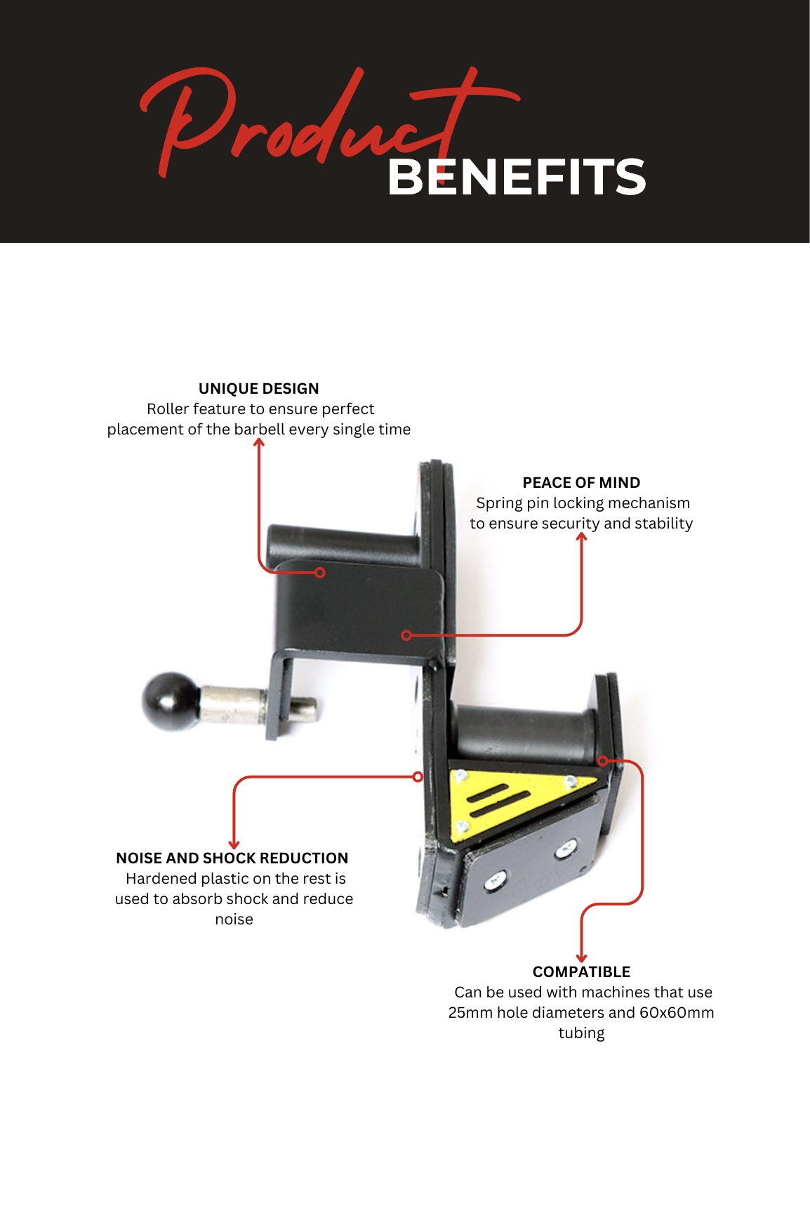 Designed for racks with 60mm x 60mm tubing and 25mm (1-inch) hole diameter, these J-Hooks feature a spring pin locking mechanism that guarantees safety and security under heavy loads. The hardened plastic insert absorbs shock, minimises noise, and protects your barbell knurling from damage.