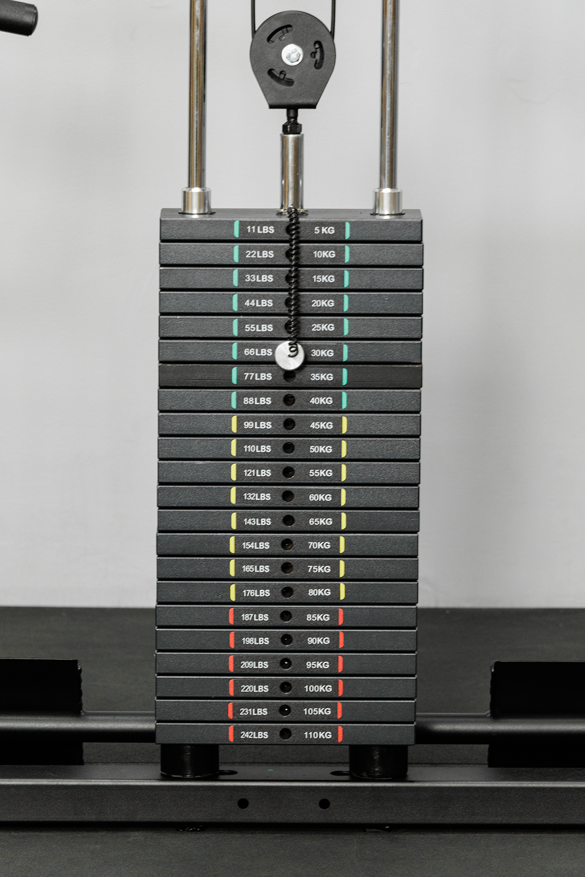 The Adjustable Dual Pulley Arms can be configured as either 4:1 or 2:1 when connected together, using a 110kg weight stack with 24 adjustable height levels. Extra resistance can be added easily using a weight stack pin.