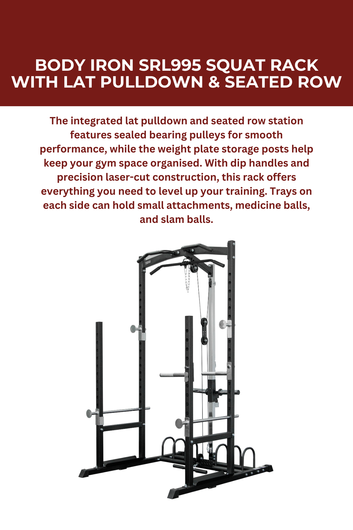 Body Iron SRL995 Squat Rack พร้อม Lat Pulldown และ Seated Row คือโซลูชันโฮมยิมแบบครบวงจรที่ออกแบบมาสำหรับนักยกน้ำหนักที่ต้องการประสิทธิภาพระดับเชิงพาณิชย์ในราคาที่เอื้อมถึง อุปกรณ์ออลอินวันนี้ช่วยให้คุณออกกำลังกายได้ครบทุกส่วนของร่างกาย ตั้งแต่สควอทและเพรส ไปจนถึง Lat Pulldown และ Seated Row ทั้งหมดนี้อยู่ในขนาดกะทัดรัดและมีประสิทธิภาพเพียงเครื่องเดียว