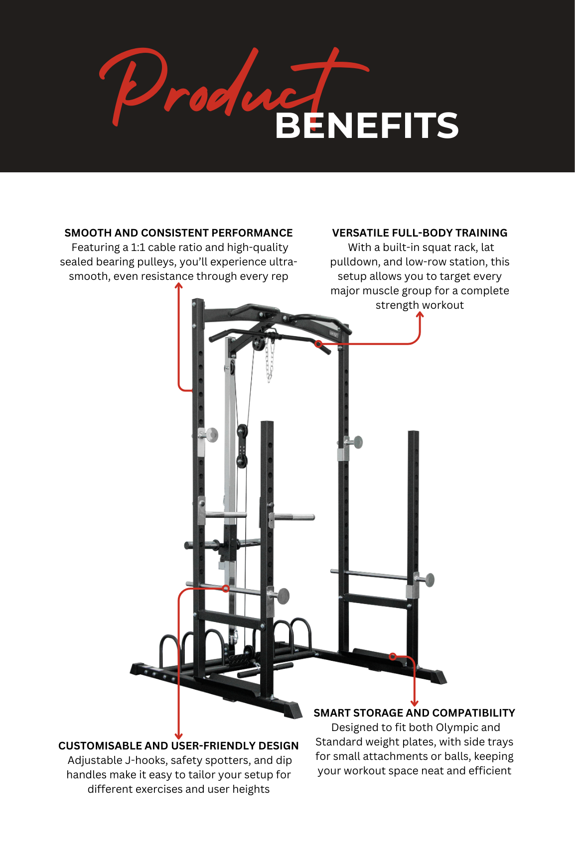 สถานีพายแบบนั่งและแบบดึงลัต ในตัวใช้ รอกแบริ่งแบบปิดผนึก เพื่อการเคลื่อนไหวที่ราบรื่นและสม่ำเสมอ เสาเก็บแผ่นน้ำหนัก ช่วยให้ยิมของคุณเป็นระเบียบเรียบร้อย ขณะที่ ด้ามจับดิป และท่อตัดด้วยเลเซอร์รับประกันความทนทานยาวนาน ถาดด้านข้างที่สะดวกสบายสำหรับจัดเก็บอุปกรณ์ขนาดเล็ก ลูกบอลแพทย์ และ ลูกบอลสแลม